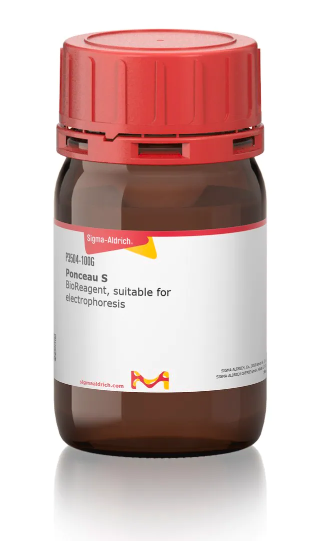 | General description【一般描述】 | Ponceau S是一种重氮染料的钠盐。它可用于制备染色剂,可用于硝酸纤维素膜或PVDF膜(蛋白质印迹)上蛋白质条带的快速可逆染色,也可用于在醋酸纤维素膜上对蛋白进行染色。可通过水洗涤逆转染色过程,其有助于随后的免疫学检测。 以下是两种常见的染色配方: 溶于5%乙酸中的0.1%Ponceau S(w/v) 溶于30%TCA和30%磺基水杨酸中2%Ponceau S(w/v) |