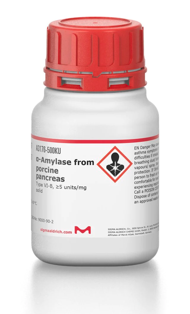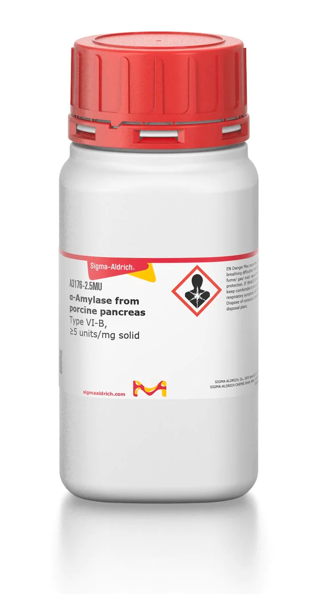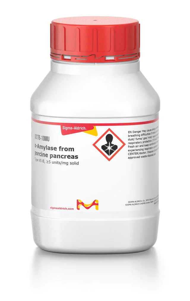 | General description【一般描述】 | 我们致力于为您提供更环保的替代产品,以符合“绿色化学的12项原则”的一项或多项原则要求。该产品针对淀粉乙醇研究进行了优化,可提高能效并防止浪费。有关详细信息,请参阅《Biofiles》的文章。 分子质量:51-54 kDa。 从猪胰腺中分离的α-淀粉酶是一种糖蛋白。它是由约475个残基组成的一条多肽链(包含2个SH基团和4个二硫键)以及一个紧密结合的Ca2+ (稳定性所必需的)组成的。氯离子是活性和稳定性所必需的。活性pH范围为5.5至8.0,最适pH为7。 |