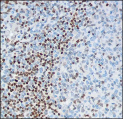 | General description【一般描述】 | Forkhead box protein P1 (FOXP1) is a transcriptional repressor that plays an important role in the development of the brain and lung in mammals. The gene encoding this protein may act as a tumor suppressor as it is lost in several tumor types and maps to a chromosomal region (3p14.1) reported to contain a tumor suppressor gene. It is essential transcriptional regulator of B cell development. PAX5/FOXP1 translocation t(9;3)(p13;p14.1) is found in acute lymphoblastic leukemia. FOXP1 is positive in subset of diffuse large B-cell lymphoma and mucosa-associated lymphoid tissue lymphomas. |