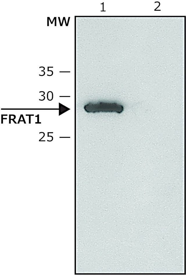 | technique(s) | western blot: 1-2 μg/mL using using rat liver extract (S1 fraction) and a HEK-293T cell lysate expressing human FRAT1. |