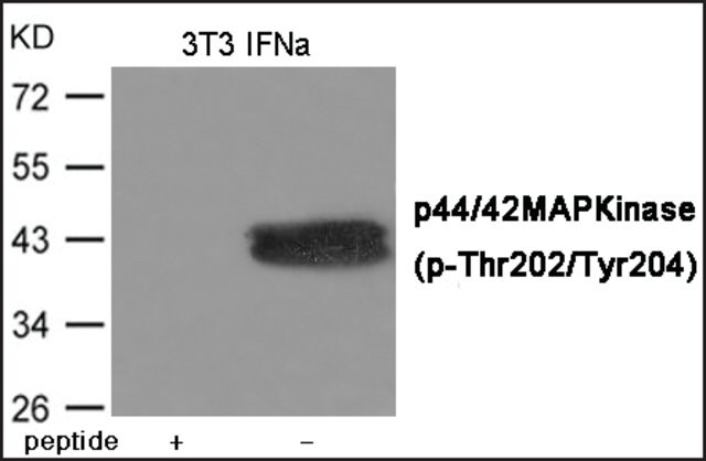 | Immunogen【免疫原】 | 来源于人 p44/42 MAP 激酶的苏氨酸 202/酪氨酸 204 (F-L-T (p)-E-Y (p)-V-A) 磷酸化位点附近的肽序列。  |