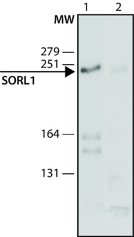 | General description【一般描述】 | Sortilin related receptor 1 (SORL1), a multifunctional protein, is also known as SorLA-1, LR11, LRP9 and gp250. It is a type-I transmembrane protein highly expressed in neurons. This protein belongs to the low-density lipoprotein receptor family. It contains a transmembrane domain, a large extracellular domain and a short cytoplasmic tail. SORL1 gene is located on human chromosome 11q 23/24. This mosaic receptor contains a domain that shares similarity with the vacuolar protein sorting 10 (VPS10) and with the low-density lipoprotein receptor (LDLR) family of proteins. |