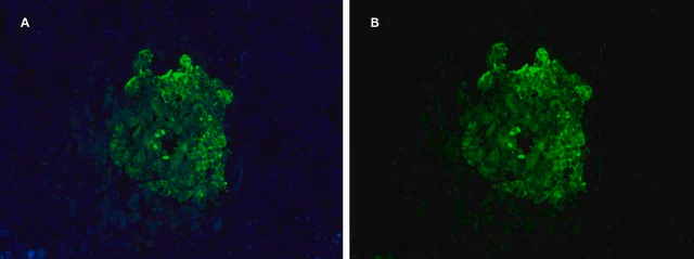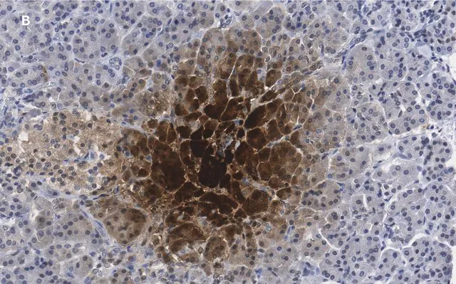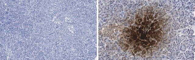 | Application【应用】 | Anti-Pancreatic Polypeptide, clone 3H5 ZooMAb, Cat. No. ZRB939, is a recombinant Rabbit Monoclonal Antibody that detects pancreatic polypeptide and has been tested for use in Immunocytochemistry, Immunohistochemistry (Paraffin), Immunofluorescence, and Western Blotting. Immunofluorescence Analysis: A 1:400 dilution from a representative lot detected Pancreatic Polypeptide in human pancreas tissue sections. Immunohistochemistry (Paraffin) Analysis: A 1:400 dilution from a representative lot detected Pancreatic Polypeptide in human pancreas tissue sections. Immunocytochemistry Analysis: A 1:100 dilution from a representative lot detected Pancreatic Polypeptide in TGP52 cell line. |