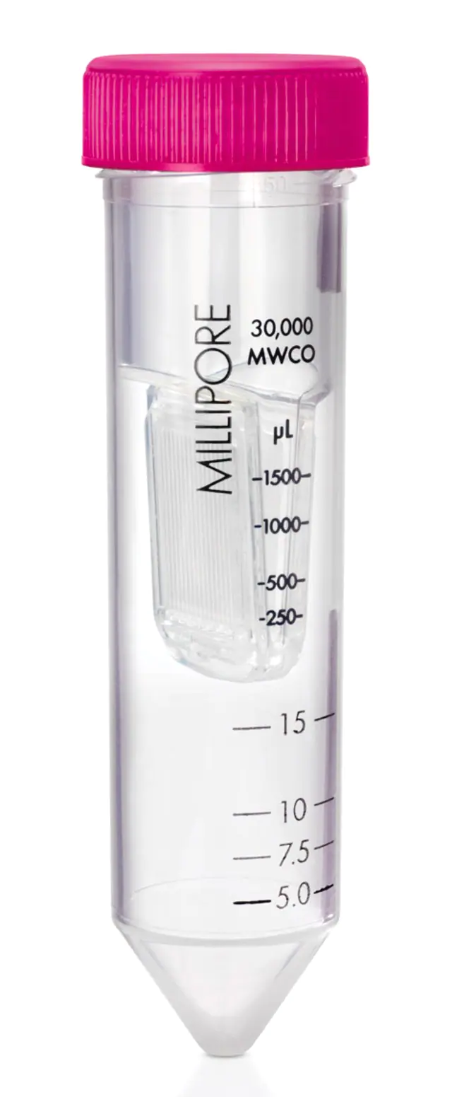 | General description【一般描述】 | Amicon® Ultra 15 mL centrifugal devices with Ultracel® 50,000 Dalton molecular weight cutoff filters provide fast ultrafiltration, and reliable retention of macromolecules. For example, bovine serum albumin (67 kDa) at 1 mg/ml initial concentration is retained at >95% . The vertical design and available membrane surface area provide fast sample processing, high sample recovery (typically greater than 90% of dilute starting solution), and the capability for 80-fold concentration. Solute polarization and subsequent fouling of the membrane are minimized by the vertical design, and a physical deadstop in the filter device prevents spinning to dryness and potential sample loss. The concentrate is collected from the filter device sample reservoir using a pipetter, while the ultrafiltrate is collected in the provided centrifuge tube. The device can be spun in a swinging bucket or fixed angle rotor. With their vertical membrane design and deadstop, Amicon®Ultra 15 mL filters deliver the highest recovery with short spin times. |