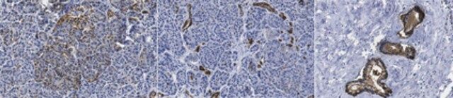 | General description【一般描述】 | Pancreas performs both the endocrine and the exocrine function. The bulk of pancreas is composed of exocrine cells that produce digestion enzymes which are released into ducts to be emptied into the duodenum. The endocrine pancreas is composed of islets of Langerhans that produce hormones. At least five distinct endocrine cell types have been identified in the endocrine pancreas, each producing a different hormone. Beta cells produce insulin, which is considered as an anabolic hormone and regulates blood glucose levels and is also involved in fat and protein synthesis. Alpha cells produce glucagon that acts when blood glucose levels are low. Ductal cells of pancreas form the epithelial lining of the branched tubes that deliver digestive enzymes into the duodenum. They also secrete bicarbonate to neutralize acidic contents coming in from stomach. Duct cells may contribute up to 10% of all pancreatic cells. Acinar cells function as a unit of the exocrine pancreas and they synthesize, store, and secrete digestive enzymes (lipase, alpha amylase, trypsin, and chymotrypsin), which under normal physiological conditions are activated only after reaching the duodenum. Premature activation of these enzymes within pancreatic acinar cells can lead to acute pancreatitis. Clone HIC-2D2 can be used to mark all non-beta endocrine cell types in human pancreatic tissue. (Ref.: Dorrell, C., et al. (2008). Stem Cell Research (2008). 1(3); 183-194; Grapin-Botton, A (2005). Int. J. Biochem. Cell Biol. 37(3); 504-510; Leung, PS (2006). Int. J. Biochem. Cell Biol. 38(7); 1024-1030). |