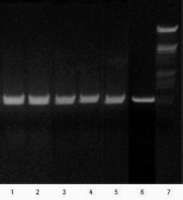 | Other Notes【其他说明】 | High Pure Technology and Silica Adsorption Kits For life science research only. Not for use in diagnostic procedures. 图1:不同均质化程序的比较。使用各种程序均质化小鼠肝脏。用高纯核糖核酸组织试剂盒从每种匀浆中纯化总核糖核酸。分离的核糖核酸的等分试样用特异性针对谷氨酸脱羧酶基因区域的引物进行反向转录。通过凝胶电泳分析cDNA产物。 泳道1:均质化:Ultra Turrax;产量:1.9 & # 956;g/mg组织;A 260/ A 280 : 2.0 泳道2:均质化:电动一次性塑料杵;产量:3 & # 956;g/mg组织;A 260 /A 280 : 2.0 泳道3:均质化:研钵和杵,20 G针头;产量:1.5 & # 956;g/mg组织;A 260 /A 280 : 2.0 泳道4:均质化:手动一次性塑料杵,20 G针头;产量:1.8 & # 956;g/mg组织;A 260 /A 280 : 2.0 泳道5:均质化:手动一次性塑料杵;产量:3.4 & # 956;g/mg组织;A 260 /A 280 : 2.0 泳道6:均质化:小珠涡旋;产量:3 & # 956;g/mg组织;A 260 /A 280 : 2.0 泳道7:分子量标记 |