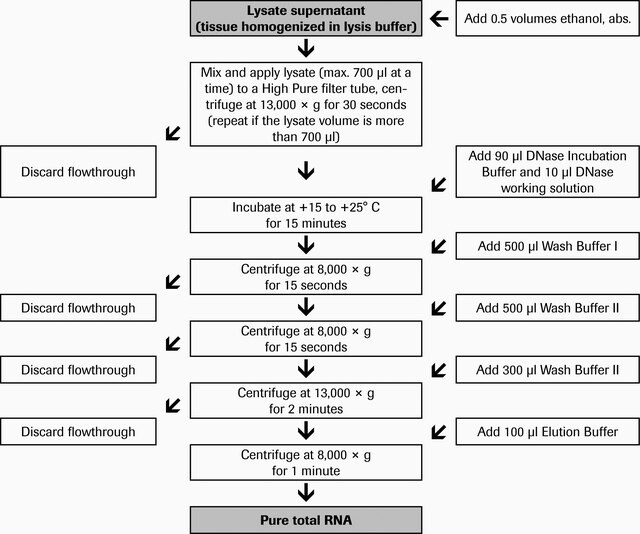 | Preparation Note【制备说明】 | Tissue samples are disrupted and homogenized in the presence of a chaotropic salt (guanidine HCL) that inactivates RNases. The homogenate is then applied to the glass fiber fleece in a High Pure Spin Filter Tube. Under the buffer conditions used in the procedure, all nucleic acids bind to the glass fiber fleece, while contaminating substances (salts, proteins, and other cellular contaminants) do not. DNA in the preparation is digested with DNase I directly on the filter. Brief wash-and-spin steps readily remove the digested DNA fragments and other cellular contaminants. The remaining purified RNA is then eluted in a small volume of low-salt buffer. |