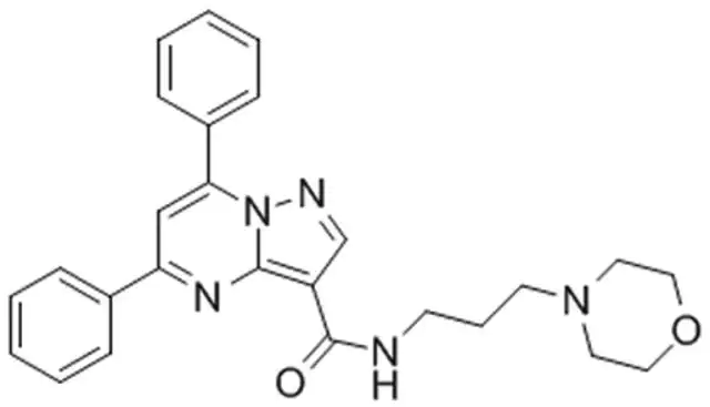 | General description【一般描述】 | A cell-permeable pyrazolopyrimidine that selectively inhibits MRP1. It is shown to increase the efficacy of vincristine and etopiside by 10- to 15-fold and 7- to 10-fold, respectively, over either of these two MRP1 substrate drugs alone in murine models of neuroblastoma (syngenic and human xenografts). As opposed to the majority of inhibitors of multidrug transporters, it is demonstrated that Reversan was not toxic by itself nor did it increase the toxicity of chemotherapeutic drug exposure in mice. Therefore, Reversan represents a new class of nontoxic MRP1 inhibitor, which may be a useful research tool for the study of neuroblastoma and other MRP1-overexpressing drug-refractory tumors. A cell-permeable pyrazolopyrimidine that selectively inhibits MRP1. It is shown to increase the efficacy of vincristine and etopiside by 10- to 15-fold and 7- to 10-fold, respectively, over either of these two MRP1 substrate drugs alone in murine models of neuroblastoma (syngenic and human xenografts). As opposed to the majority of inhibitors of multidrug transporters, it is demonstrated that Reversan was not toxic by itself nor did it increase the toxicity of chemotherapeutic drug exposure in mice. Therefore, Reversan represents a new class of nontoxic MRP1 inhibitor, which may be a useful research tool for the study of neuroblastoma and other MRP1-overexpressing drug-refractory tumors. |