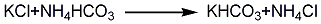 精制氯化钾溶液(250g/L)经阳离子树脂(732)柱吸附,并用蒸馏水洗涤至无氯离子流出为止。然后用200g/L的碳酸氢铵洗脱至流出液中钾离子低于2g/L为止。加热洗脱液至150℃,再将溶液浓缩至相对密度1.593左右,然后通入CO2气体进行碳化,析出碳酸氢钾结晶,离心分离后用400℃左右热风使碳酸氢钾分解为碳酸钾。反应方程式如下: