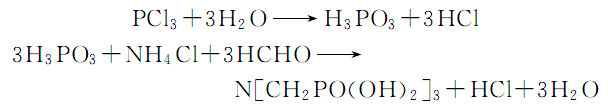 在装有搅拌器、回流冷凝器、滴液漏斗的反应瓶中,加入2mol(107g,化学纯)氯化铵,8mol(642g,37%水 溶液,分析 纯)的 甲 醛 水 溶 液,开 动 搅 拌,缓 慢 滴 加 6mol(825g)三氯化磷 ( 化学纯) ,补加一定量的去离子水,使反应体系中水与三氯化磷的比例为3.8∶1。控制滴加速度,使反应温度保持在30~40℃。必要时可通冷却水进行冷却。反应过程中有大量氯化氢逸出,必须控制回收,以免造成污染。三氯化磷加完后,缓缓升温至回流 (110℃) ,回流0.5h使反应进行完全。产物为淡黄色澄清液体。产物不经分离即可作为工业冷却水阻垢剂使用。如果制备固体产品可将反应液冷却后适当稀释 ( 约1倍左右) ,在搅拌下慢慢滴加到丙酮中,滤出沉淀,在50~60℃下真