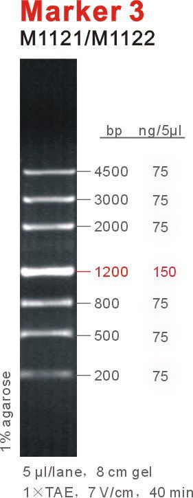 Marker 3是由7条双链线状DNA片段混合而成的DNA分子量标准(DNA Marker/ DNA Ladder),适用于确定200 bp至4.5 kb的线性双链DNA片段大小,指示带为1200 bp,便于电泳后观察。每条带都通过严格的物理定量,可用于测定目的片段的大小和含量。